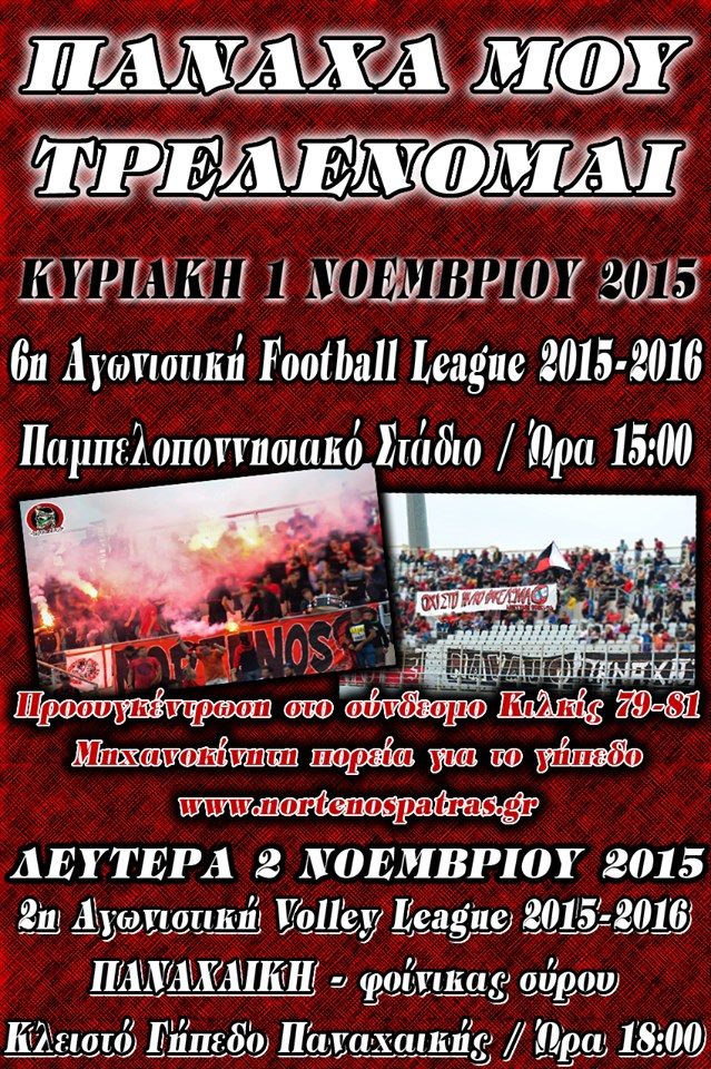 ΚΥΡΙΑΚΗ 15,00 ΠΑΜΠΕΛΟΠΟΝΝΗΣΙΑΚΟ ΣΤΑΔΙΟ :ΠΑΝΑΧΑΪΚΗ-ΖΑΚΥΝΘΟΣ (ΠΡΟΣΥΓΚΕΝΤΡΩΣΗ 13.00 ΣΤΕΚΙ -ΚΙΛΚΙΣ 79-81- ΟΛΟΙ ΜΑΖΙ ΚΑΤΕΥΘΥΝΣΗ ΓΙΑ ΤΟ ΣΤΑΔΙΟ)